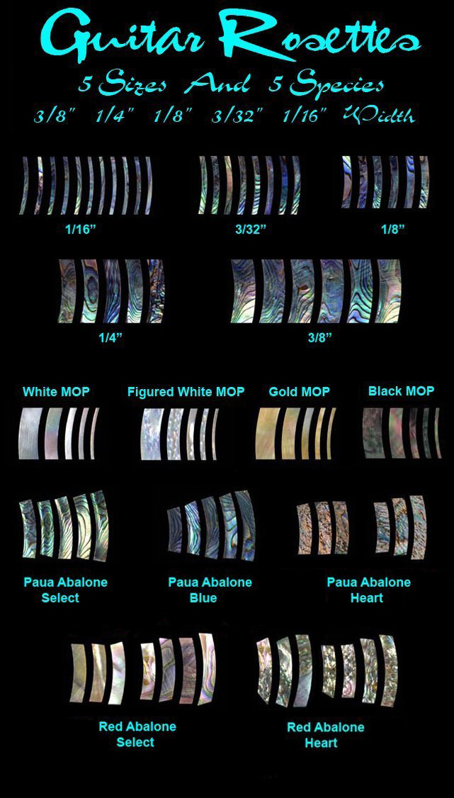 We have Round Guitar Rosettes in 5 widths and 5 species of shell material.